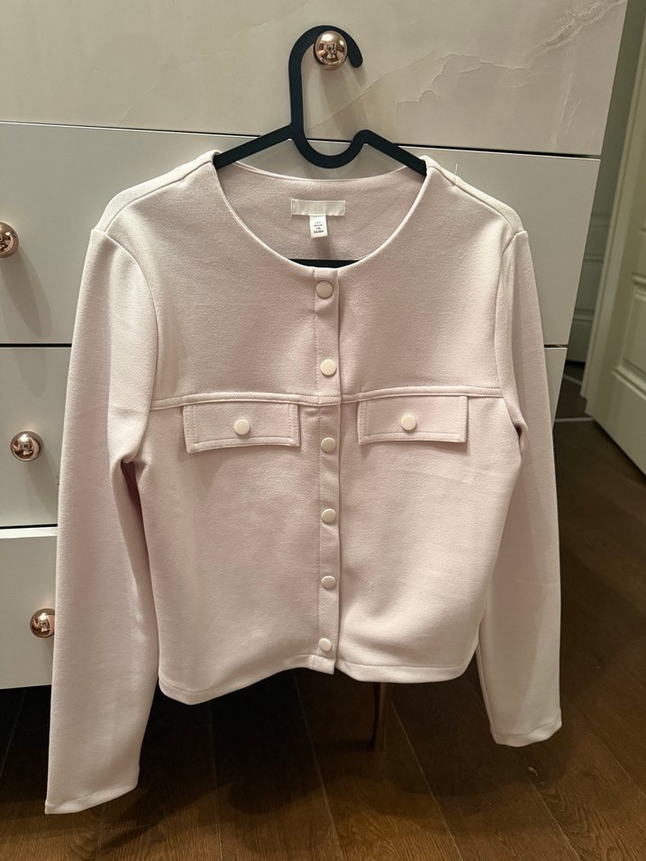 Bej renkte, düğmeli, uzun kollu ve yuvarlak yaka kadın hırka. Orta uzunlukta ve rahat kesim, yumuşak ve sıcak kumaştan üretilmiştir.