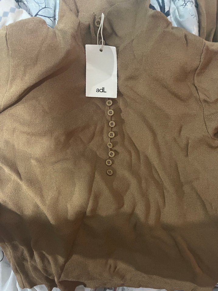 Düğmeli, uzun kollu, bej kumaştan, normal midi boyda, parlak görünümlü, kadın kazak. Günlük rahat kullanıma uygun. Marka: adL.