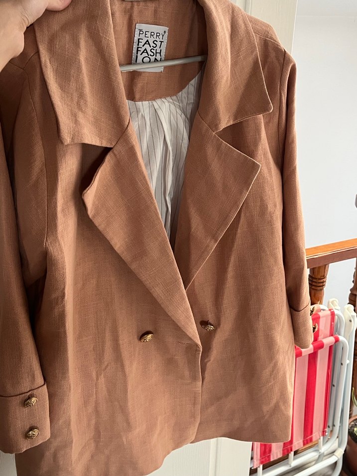 Bej keten kumaştan, düğmeli, uzun kollu, normal boy midi blazer. Trendy ve günlük kullanım için uygun, PERRY markalı.