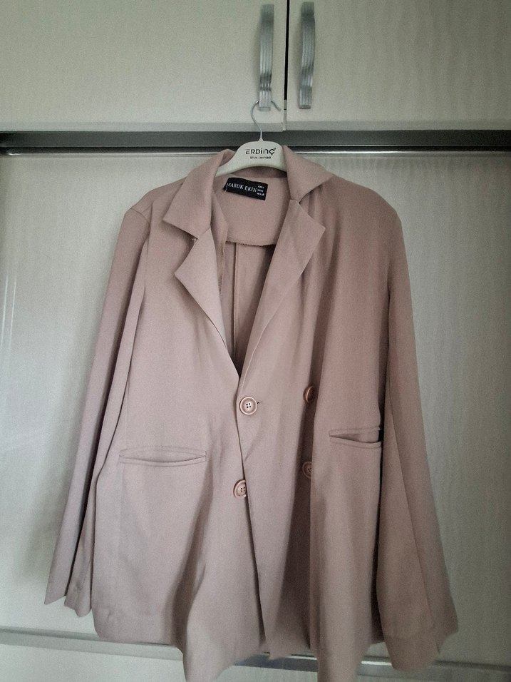 Bej keten kumaştan, düğmeli, kısa yakalı ve uzun kollu kadın blazer ceket. Rahat kesimi ve günlük kullanıma uygun tarzı ile öne çıkar.