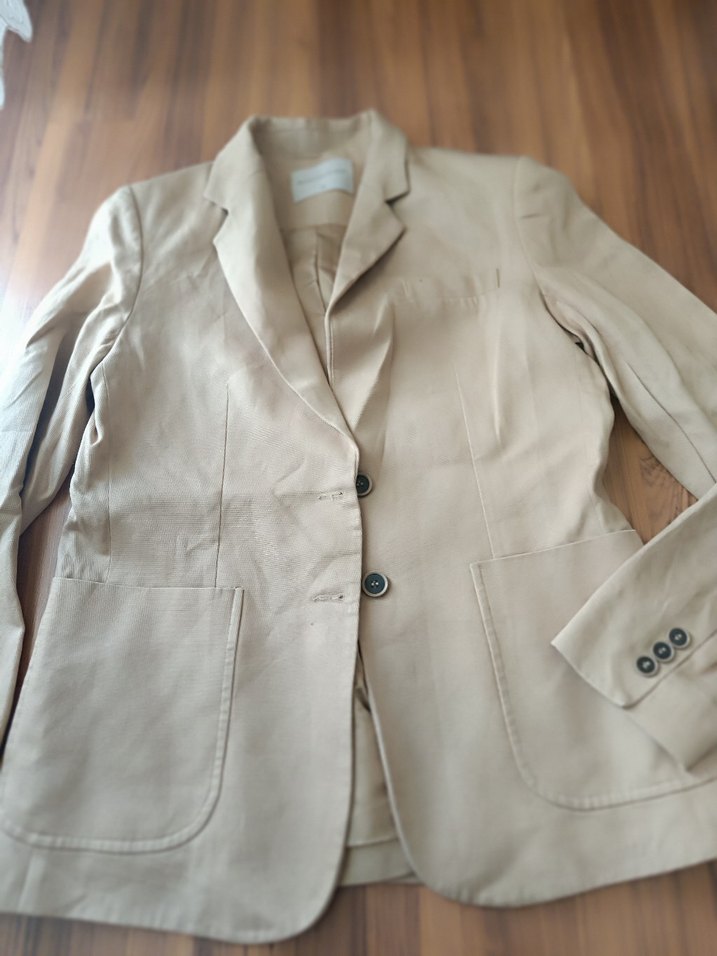 Ofis için uygun, keten kumaştan yapılmış bej renkli, düğmeli, normal kesim ve uzun kollu kadın blazer ceket.