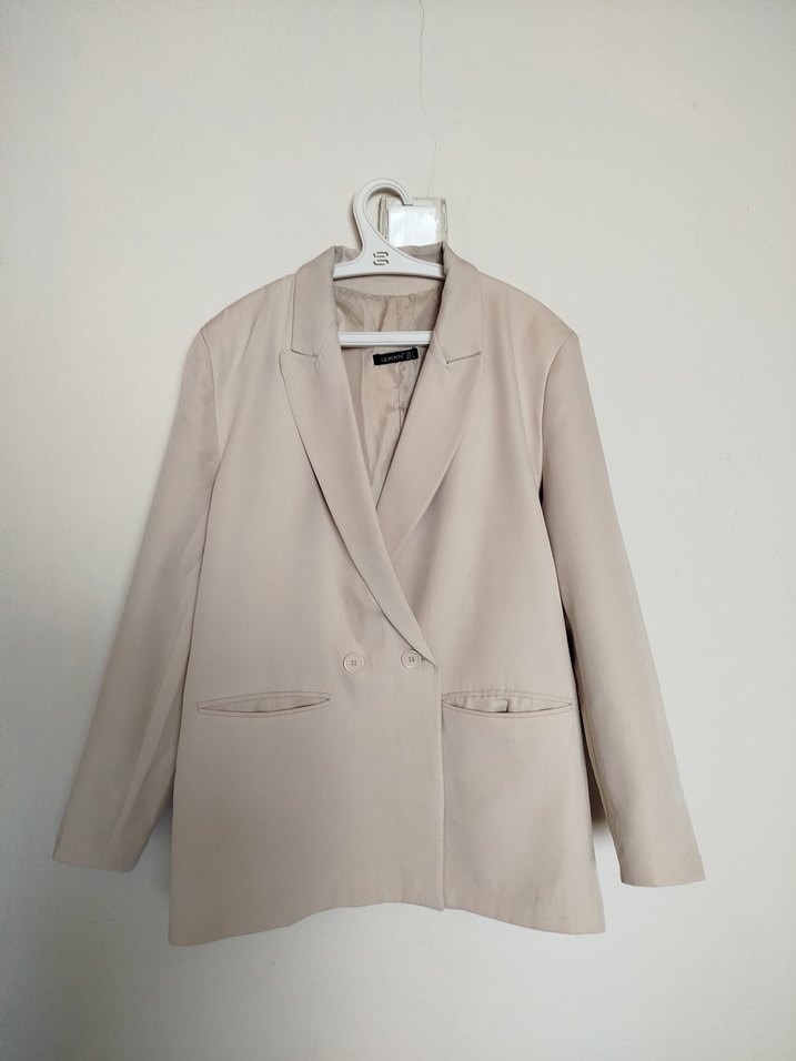 Bej renkte, keten kumaştan yapılmış, düğmeli, yakalı, uzun kollu kadın blazer ceket. Ofis için uygun, klasik şıklık sunar.