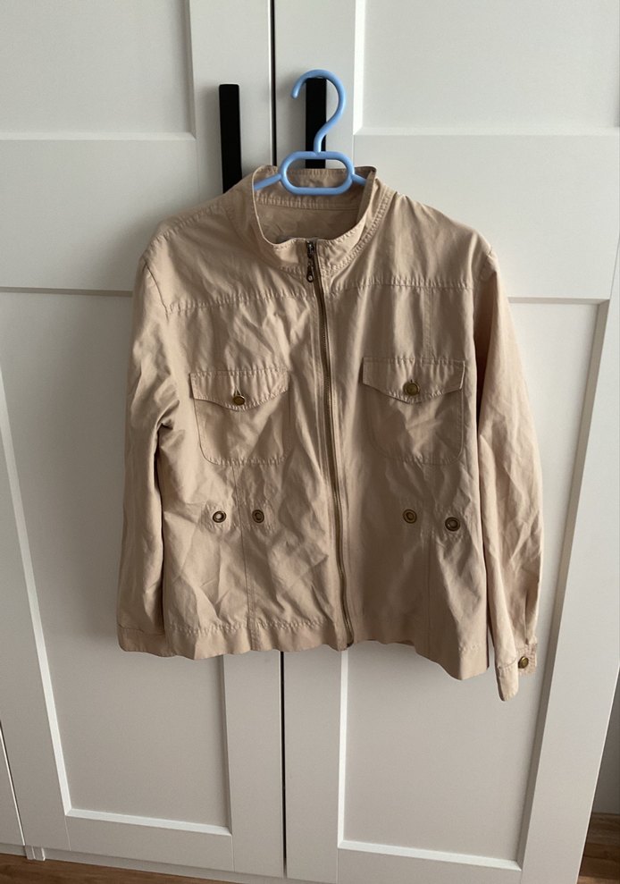 Bej keten kumaştan, düğmeli ve uzun kollu, bol kesim günlük kullanıma uygun kadın ceket.