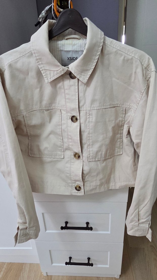 Bej renkli keten kumaştan, düğmeli, uzun kollu, notched lapel yaka ve bol kesim kadın ceket. Günlük kullanım için uygundur.