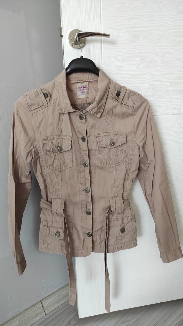 Bej renkte, keten kumaştan yapılmış kadın ceket. Düğmeli, uzun kollu ve kısa model, günlük rahat kullanım için uygundur. Ürün temiz kullanılmıştır. M bedendir. Önde alt kısımda 2 cebi, üst kısımda 2 cebi bulunur. Belden kendi kuşağı vardır. Omuzdan boyu 58 cm'dir. Omuz genişliği 12,5 cm'dir. Kol uzunluğu 62 cm'dir. Kuşağı 126 cm'dir.
