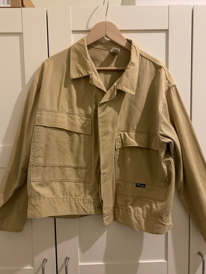 Bej keten kumaştan, düğmeli, bol kesim, notched yaka ve uzun kollu midi uzunlukta kadın ceket. Günlük rahat kullanım için uygundur.