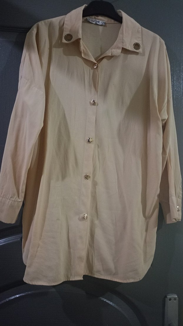 bir kere giyildi Bej renkli, keten kumaştan yapılmış, düğmeli, uzun kollu, yakalı ve midi boyda kadın gömleği. Rahat kesimiyle gündelik sokak stiline uygun.