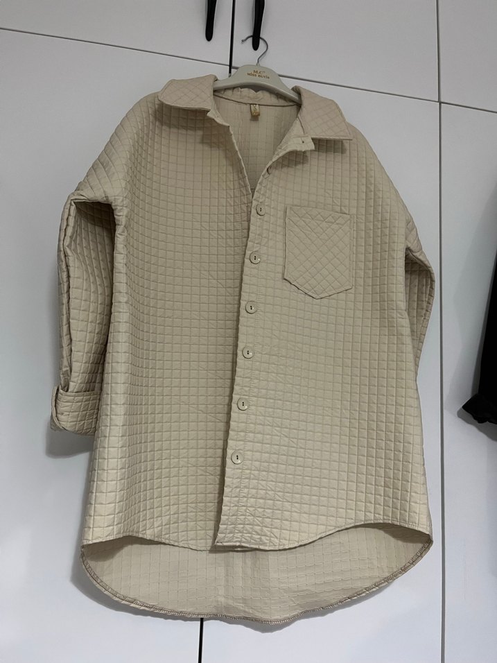 Bej renkli, keten kumaştan, düğmeli, uzun kollu, cep detaylı ve notlu yaka modelinde salaş kadın gömleği. Günlük rahat kullanıma uygundur.