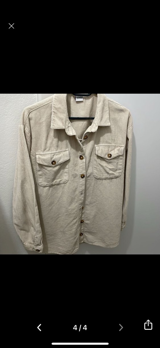 Bej keten kumaştan, düğmeli, uzun kollu ve yakalı kadın gömleği. İki cep ve rahat kesimle günlük sokak stili için uygundur.