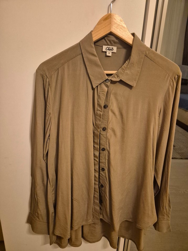 Bej keten kumaştan, düğmeli, uzun kollu, yakalı ve bol kesim kadın gömleği. Günlük kullanıma uygundur.