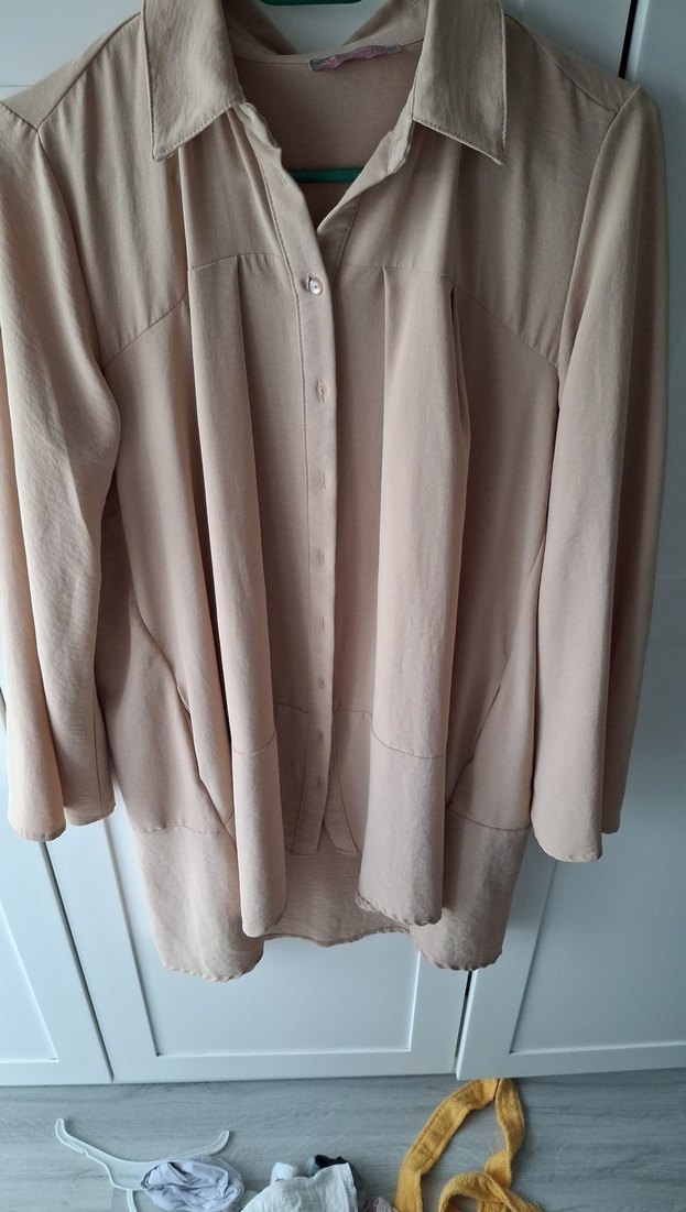 Bej renkli, düğmeli, keten kumaştan, uzun kollu, normal midi boyda, notched lapel yakalı bol kesim kadın gömleği. Ofis kullanımı için uygundur.