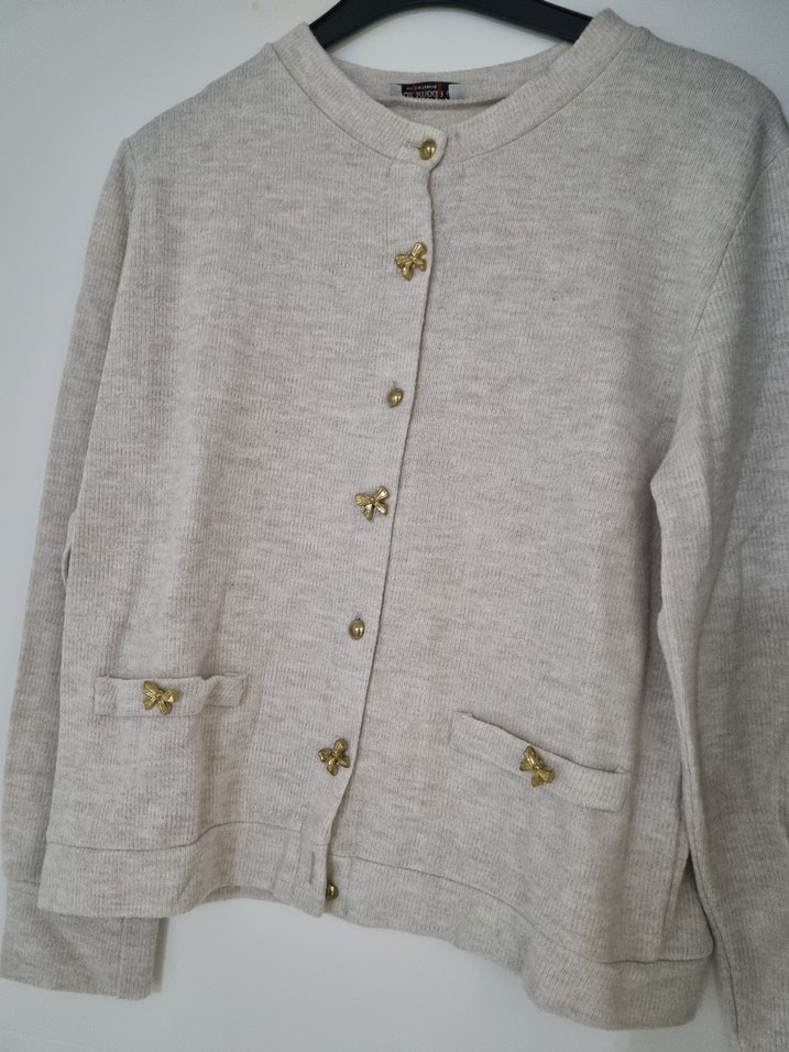 Bej renkli keten hırka, yuvarlak yaka ve uzun kolludur. Düğmeli, bol kesim ve cep detaylarına sahiptir. Günlük kullanıma uygundur.