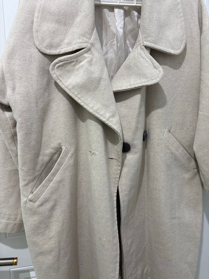 Bej keten kumaştan yapılmış, düğmeli ve kırlangıç yaka detaylı kadın midi kaban. Uzun kollu, bol kesim ve minimalist tarzda, günlük kullanıma uygun.