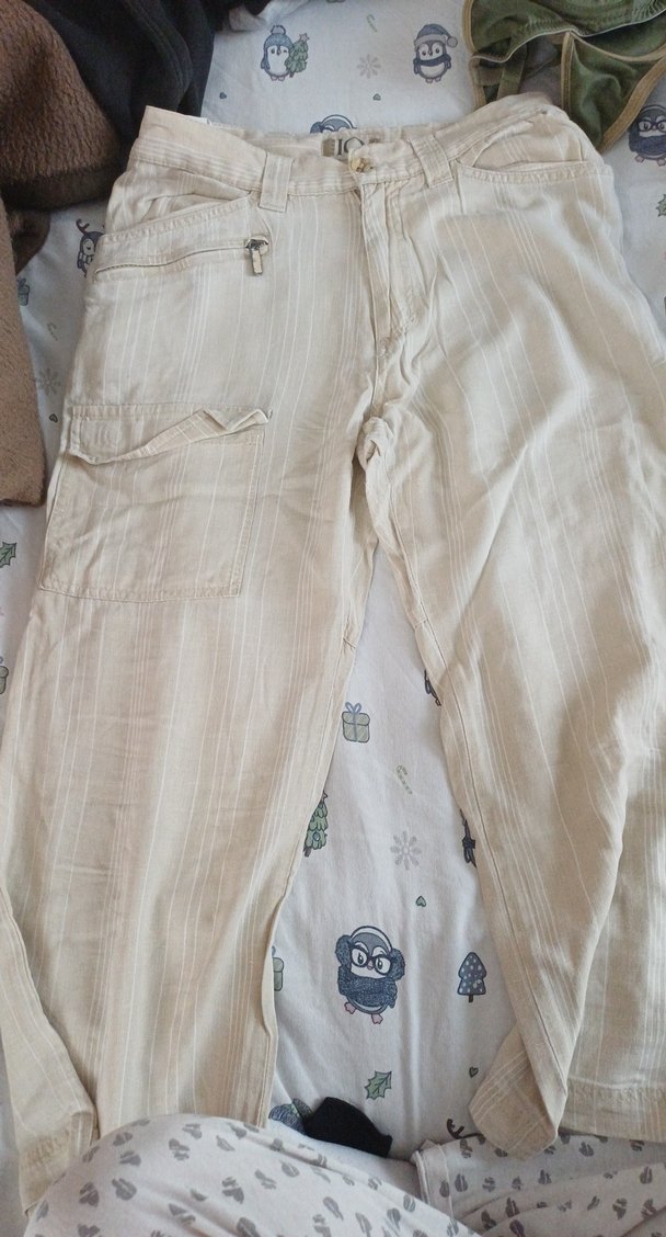 Bej renkli, keten kumaştan, düğmeli ve midi boyda rahat kesim kadın pantolonu. Günlük kullanıma uygun casual tarzda.Ürün çok iyi durumdadır.Hiçbir kusuru yoktur.