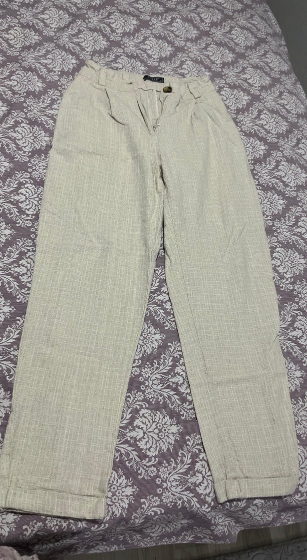 Bej keten kumaştan, normal boy, düğmeli ve regular fit kesime sahip kadın pantolonu. Rahat ve günlük stil için uygun.