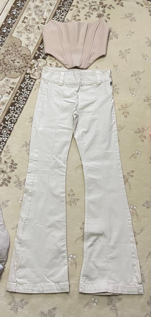 Bej keten kumaştan, düğmeli ve normal kesim kadın pantolon. Günlük rahat kullanım için uygundur, desensiz ve midi boyda.