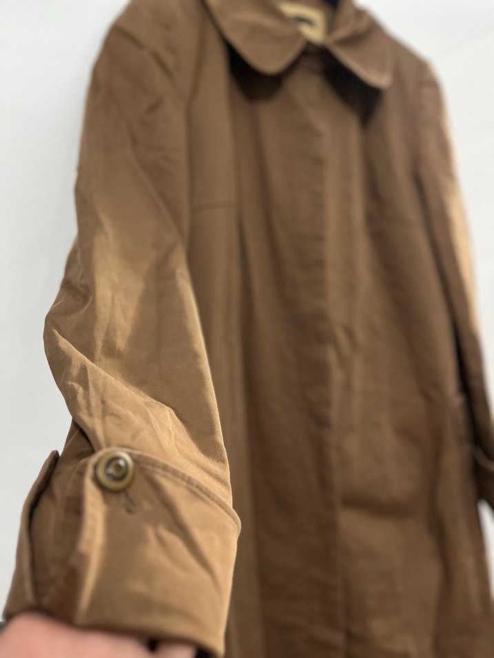 Bej renkli keten kumaştan yapılmış, düğmeli ve yakalı kadın trençkot. Uzun kollu, midi boy ve normal kesimdir. Parlak ve desensiz dokusu günlük şıklık sağlar.