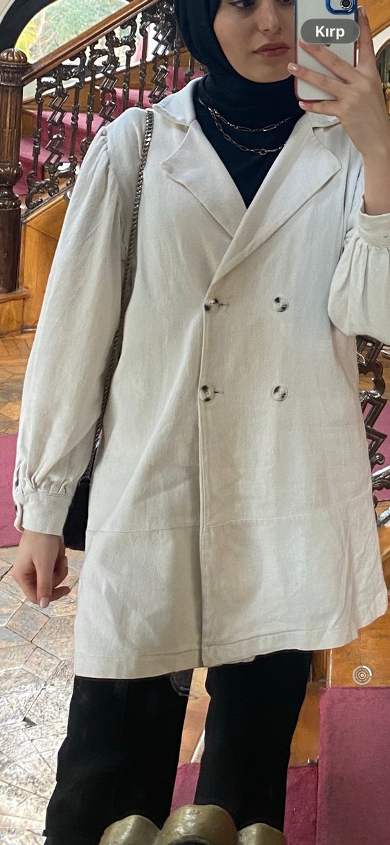 Bej keten kumaştan, düğmeli, uzun kollu, notched yakalı, midi boy, bol kesim kadın trençkot. Bohem tarzıyla Paris etkisi taşır. Günlük kullanıma uygun.