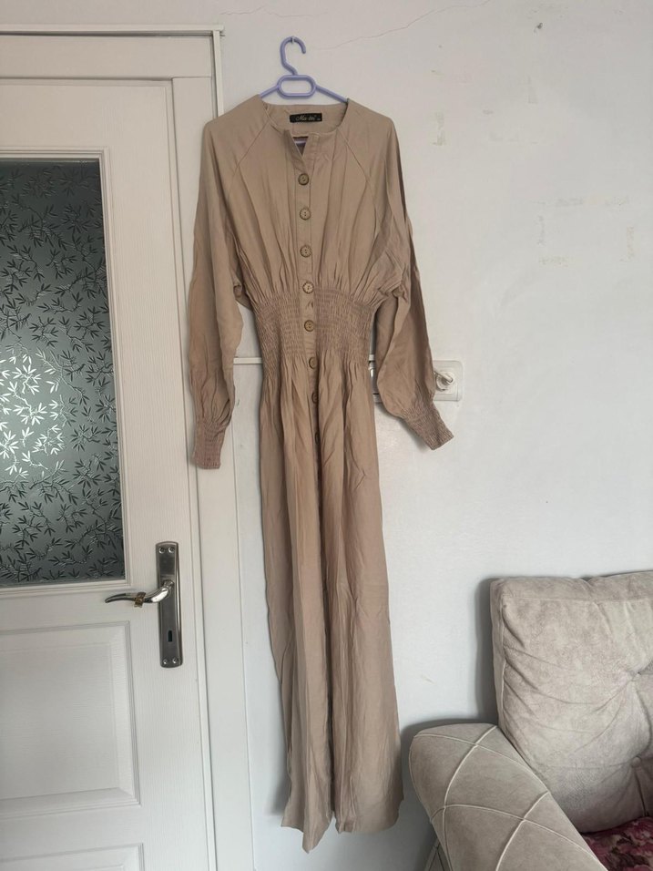 Bej renkte, keten kumaştan yapılmış, düğmeli, bol kesim uzun elbise. Uzun kollu ve V yakalı, minimalist bohem tarzını yansıtır.