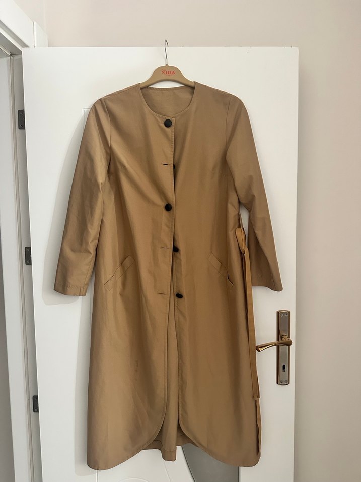 Bej renkli, düğmeli uzun keten pardösü. Uzun kollu ve regular fit kesime sahip, parlak dokulu normcore stilde günlük kullanım için ideal. Sorunsuz kuşağı kayıp sadece