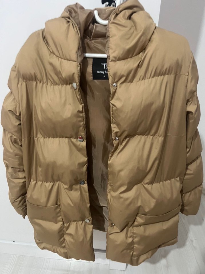 Bej, parlak görünümlü, düğmeli ve vücuda oturan kesime sahip kadın kışlık mont. Uzun kollu, kesik yaka ve şişme, rahat ve şık sokak stili için uygun. 1 düğmesi eksik.