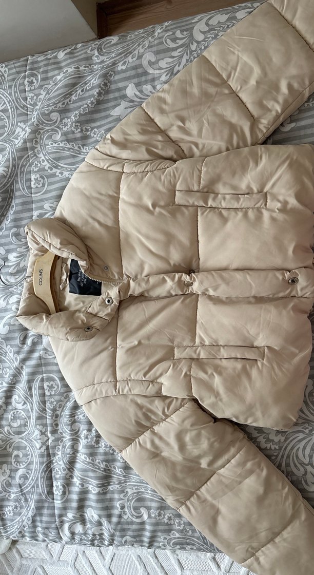 Bej renkte, düğmeli ve normal boyda, kesimi vücuda oturan kadın kışlık mont. Yumuşak sentetik kumaştan, şal yaka ve askılı kollu, rahat ve şık sokak stili için uygun.
