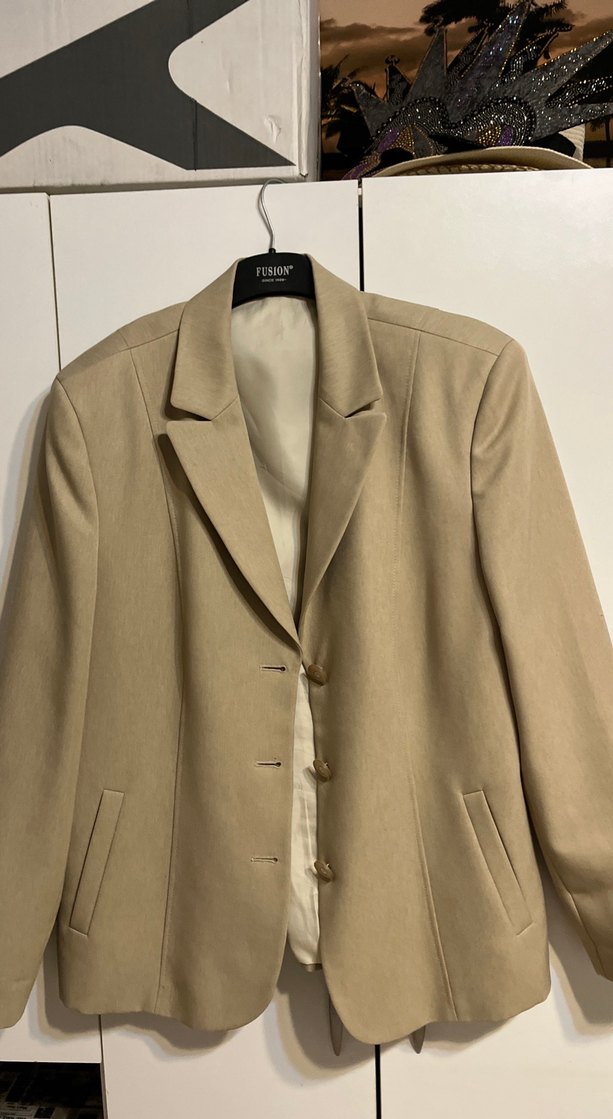 Bej renkli keten kumaştan, klasik kesim ve düğmeli önü olan uzun kollu kadın ceket. Ofis için uygundur.
