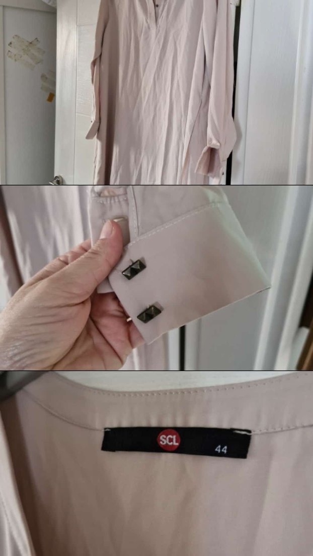Bej renkli, düğmeli manşetlerde gri kol düğmeleri bulunan kadın gömleği. Desensiz ve 'SCL' etiketi mevcut. Günlük iş kıyafeti için uygun.