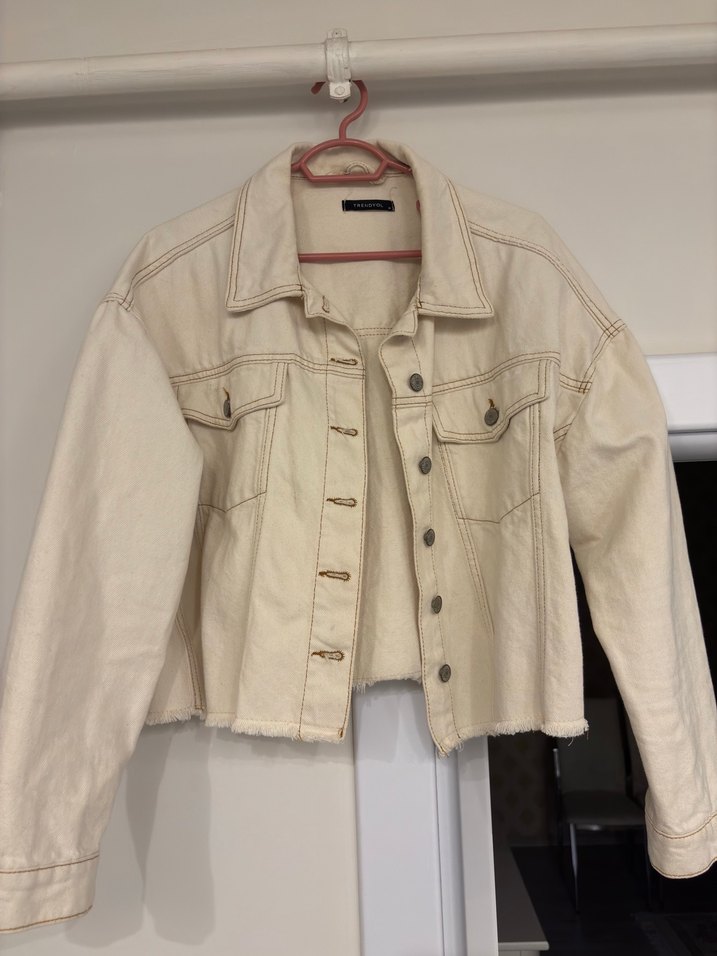 Uzun kollu, düğmeli, bej renkli kadın denim ceket. Salaş kesimi ve kesik uç detaylarıyla günlük sokak stiline uygun.