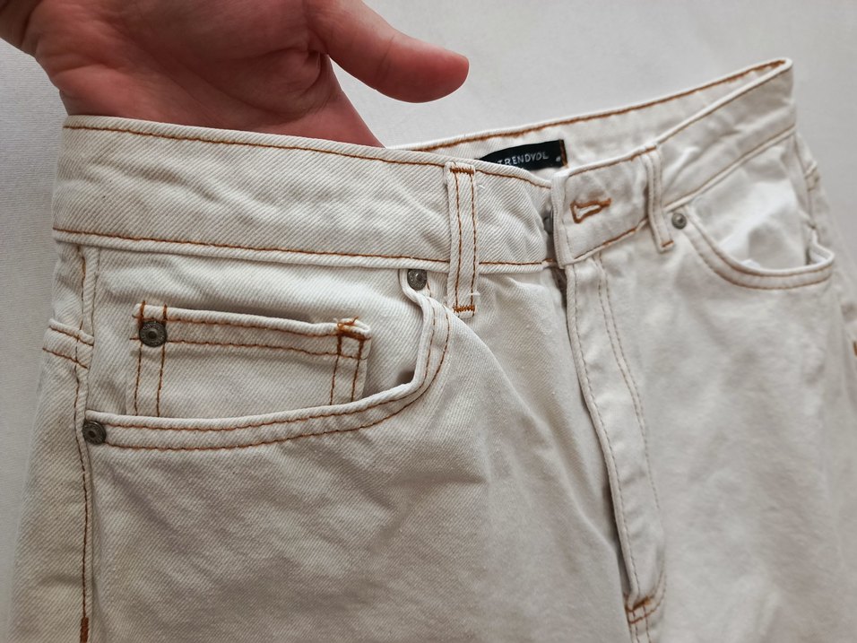 Pamuklu bej kadın kot pantolon, düğmeli ve bol kesim. Midi boy, sokak stiline uygun, günlük kullanım için ideal. mom jean 1 2 kere giyildi