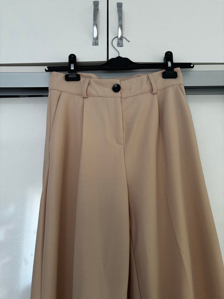 Düğmeli, bol kesim, bej midi kadın kumaş pantolon. Yumuşak sentetik kumaştan, minimalist ve ofis kullanımı için uygun. Cepleri var. Uzunluğu 107 santim, iç bacak boyu 75, bel 33, ağdan kalçaya genişliği 30, paça 28 santim, bel ağ uzunluğu 30 santim.