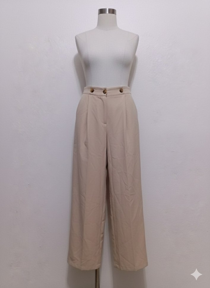 Bej renkli, düğmeli bel detaylı, midi boy ve regular fit kumaş pantolon. Minimalist ve ofis stiline uygun, desensiz tasarım.