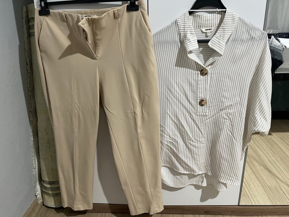 Bej Düğmeli Kadın Kumaş Pantolon ve gömlek