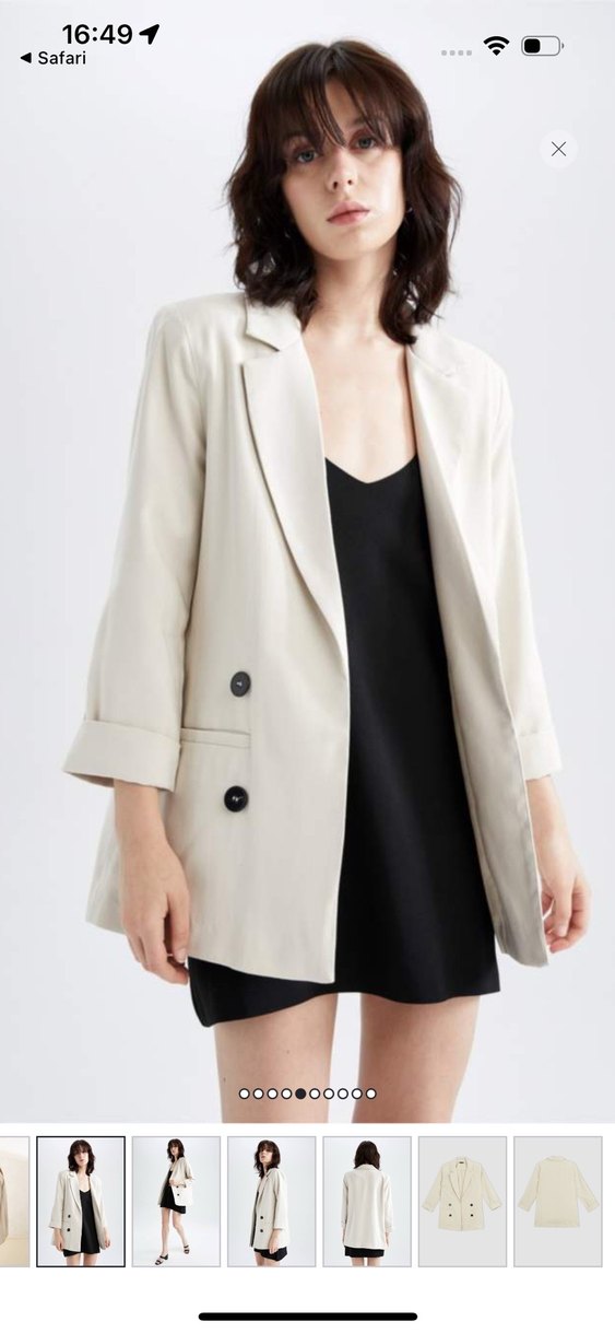 Bej renkli, düğmeli ve kesik yakalı kadın blazer. İpeksi dokusuyla midi boy ve rahat kesim, ofis ve günlük şıklık için ideal.