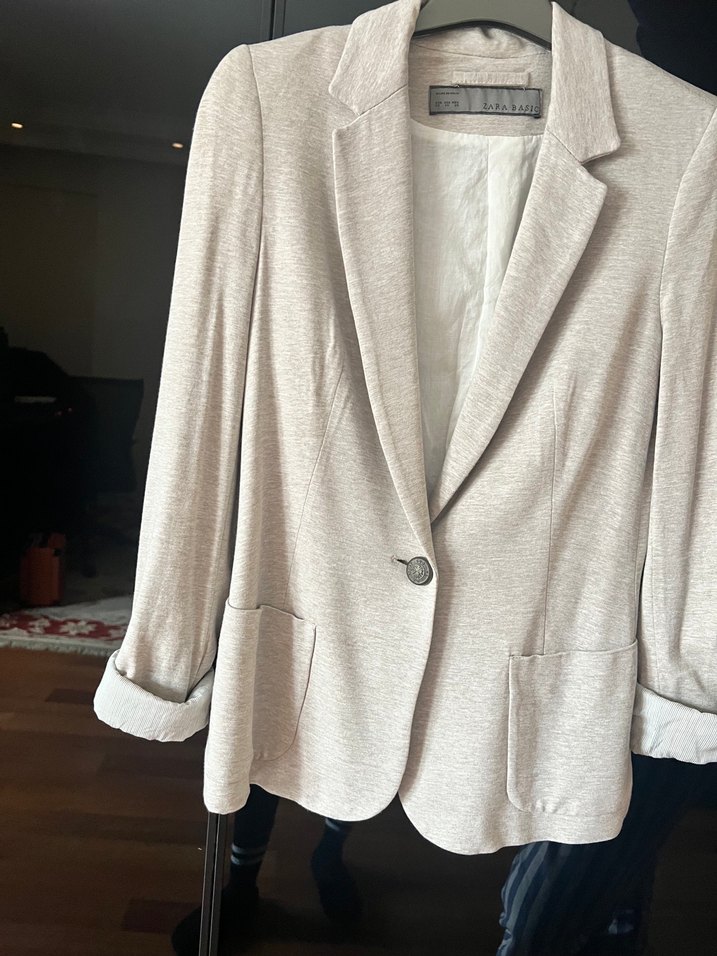 Bej renkli, düğmeli, pamuklu kadın blazer ceket. Normal uzunlukta, uzun kollu ve regular fit. Ofis için uygundur.