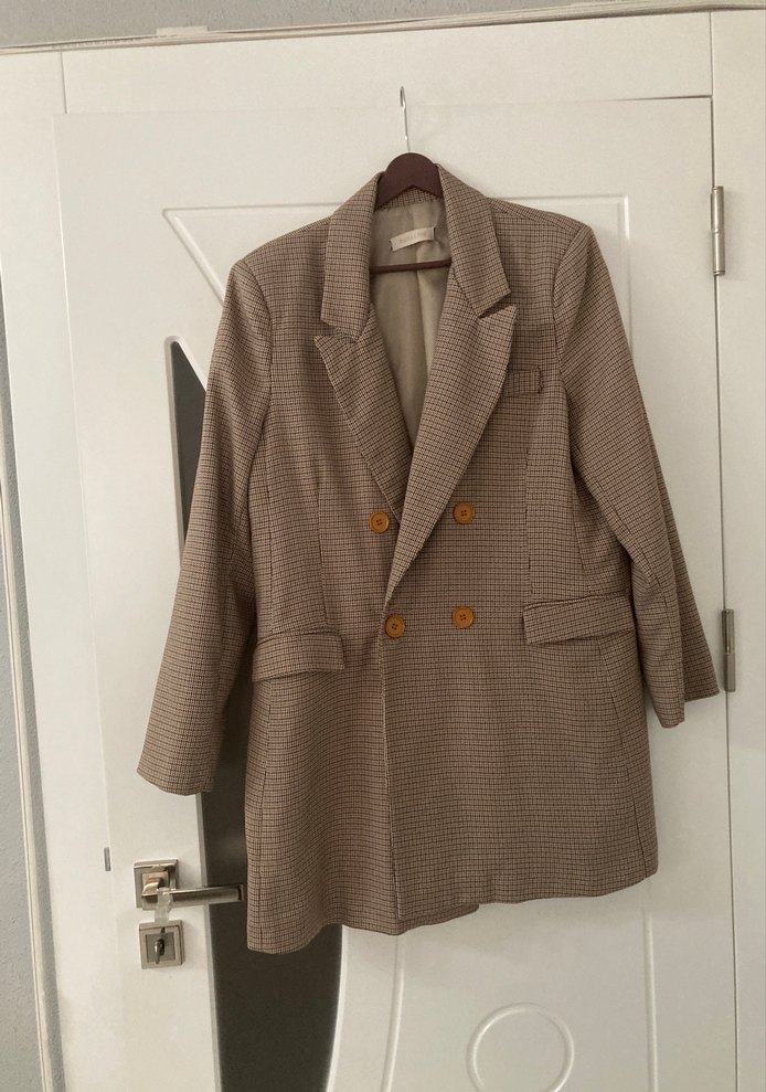 Bej renkli, düğmeli, notched lapel yakalı kadın blazer ceket. Uzun kollu, midi boy ve regular fit kesim. Ofis kullanımı için uygundur.