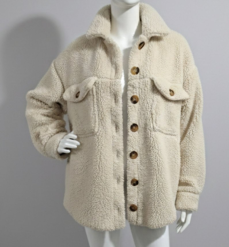 Bej renkli, düğmeli kadın ceket, yakalı ve uzun kolludur. Yumuşak ve sıcak kumaştan yapılmış, salaş kesim ve normal midi boydadır.