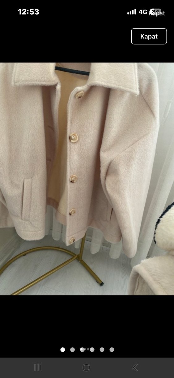 Bej düğmeli kadın midi ceket, kesik yaka ve uzun kollu. Yumuşak, rahat kumaştan, bol kesim ve desensiz tasarım. Günlük kullanıma uygun.