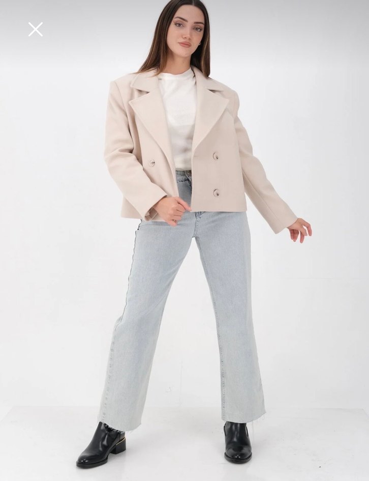 Bej renkte, düğmeli ön kısımlı ve kesik yaka detaylı midi boy kot ceket. Uzun kollu ve rahat kesime sahip, günlük kullanıma uygundur.