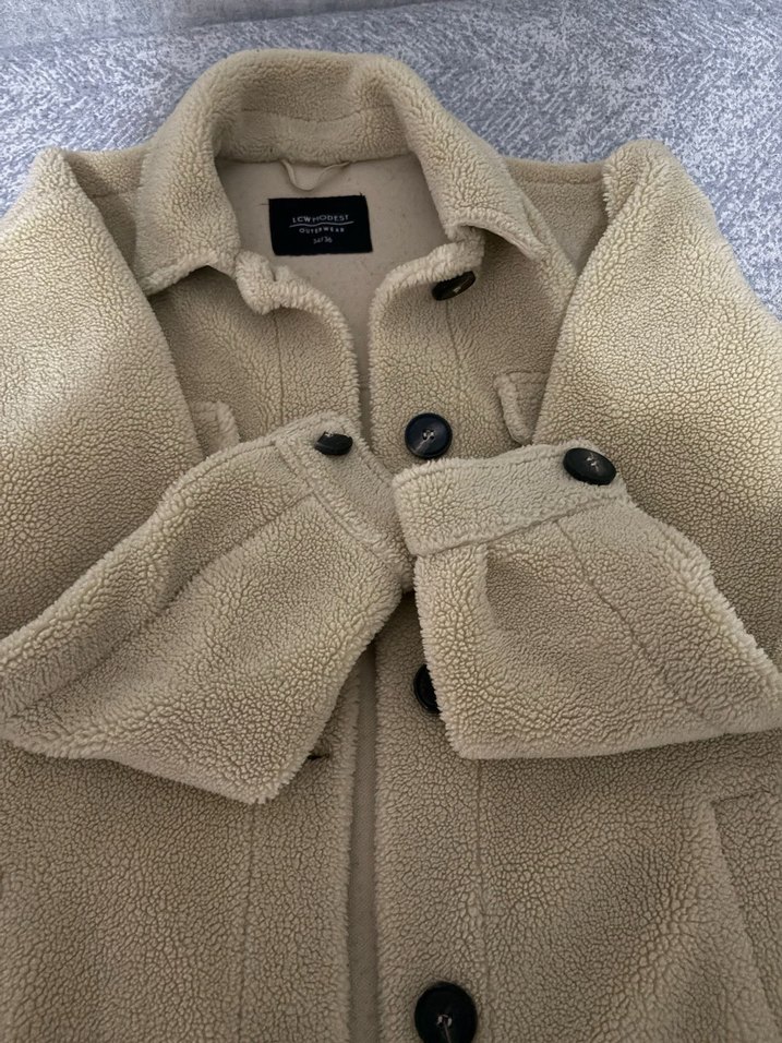 Bej rengi, düğmeli, uzun kollu, gevşek kesim kadın midi ceket. Yumuşak ve rahat dokusu günlük kullanıma uygundur.