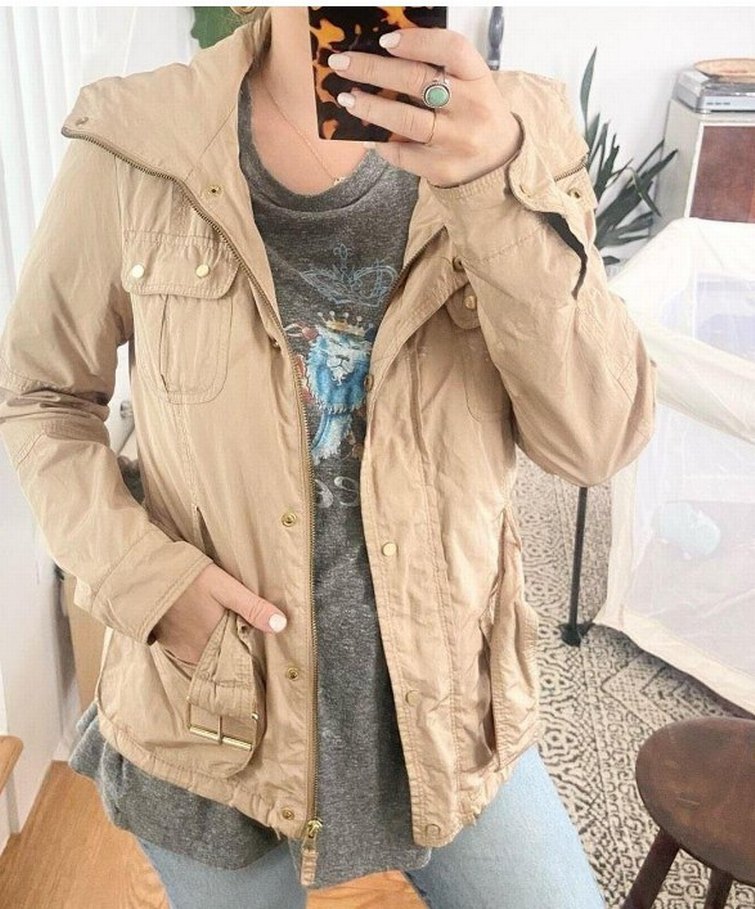 Bej renk, düğmeli, uzun kollu ve yüksek yakalı kadın midi ceketi. Rahat kesimi ve sentetik kumaşıyla günlük sokak stili için uygundur.