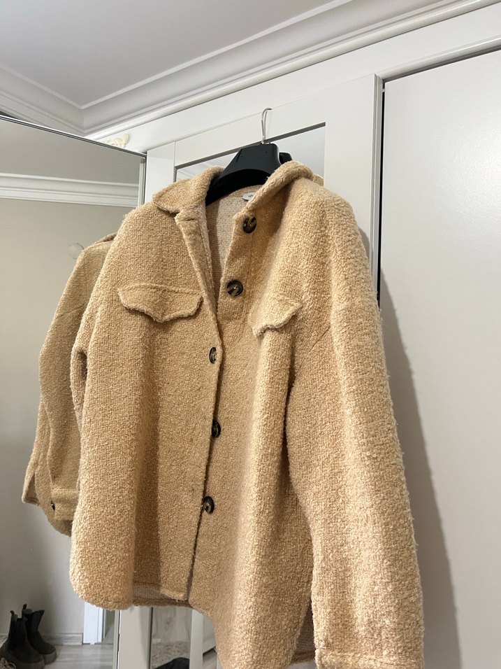 Bej renkte, yumuşak ve sıcak kumaştan yapılmış, düğmeli ve uzun kollu kadın midi ceket. Rahat kesimi ve yakasıyla gündelik kullanıma uygundur.