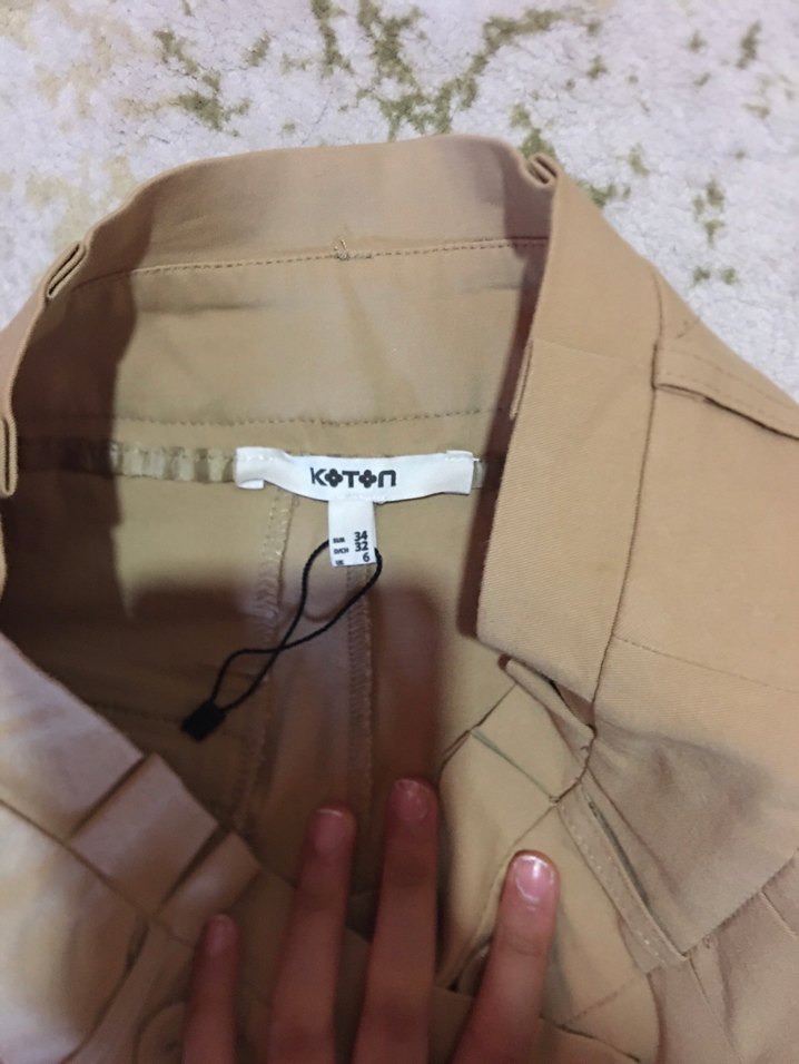 Bej renkte, düğmeli ve midi boyda kadın kumaş pantolon. Normal kesim ve günlük kullanıma uygun rahat bir model.