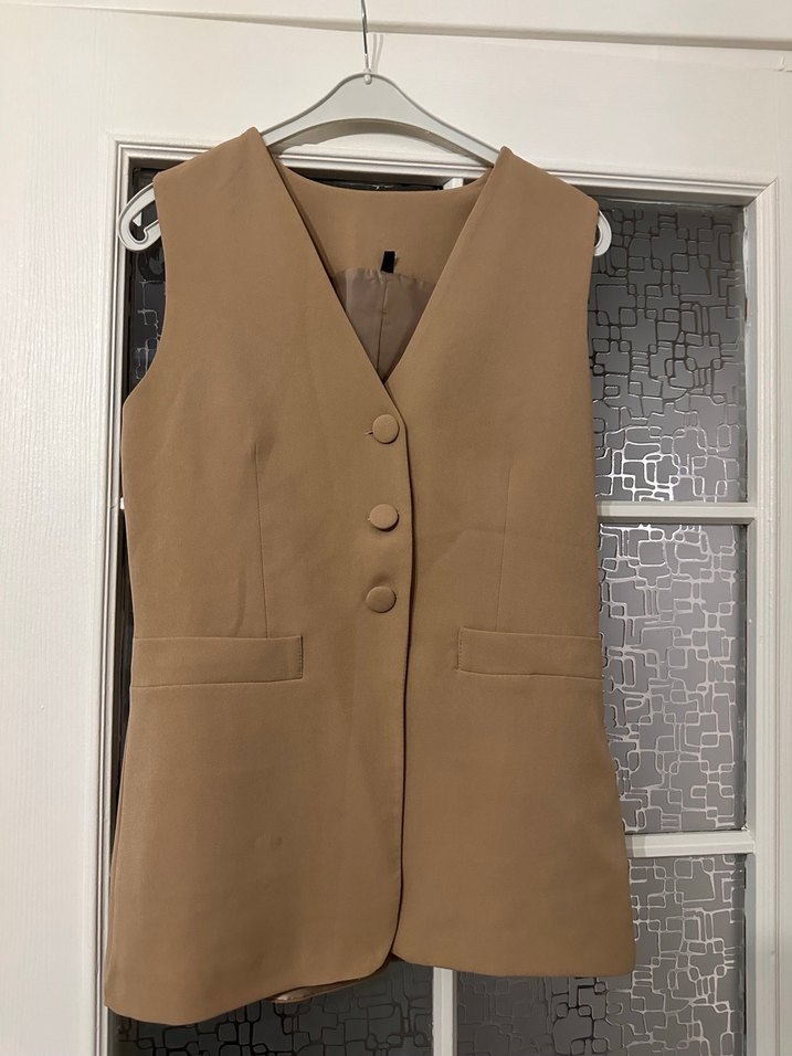 Bej renkli, düğmeli ve kolsuz kadın yeleği.