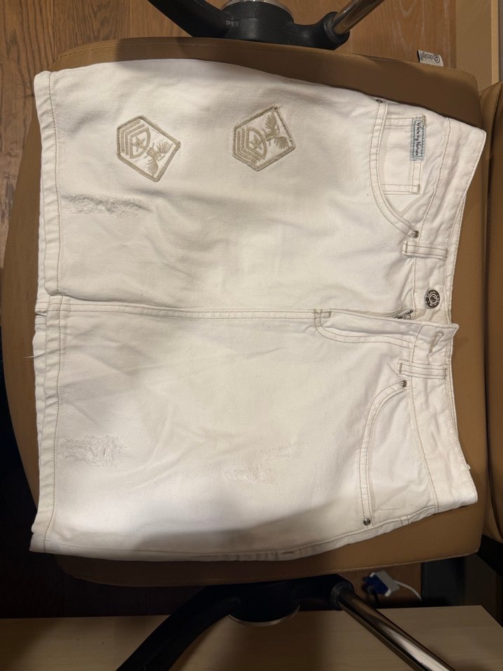 Bej renkli, düğmeli, baskılı detaylara sahip, bol kesim kadın mini etek. Sentetik kumaştan, günlük rahat kullanım için uygundur. Butikten alınmıştı