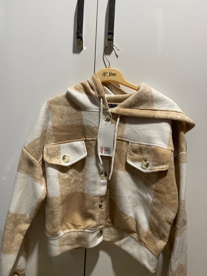 Bej renkli, düğmeli, uzun kollu, kısa ve oversize kesimli kadın gömleği. Yumuşak ve sıcak kumaştan, yakası kesik ve batik desenlidir. Günlük rahat kullanım için uygundur.