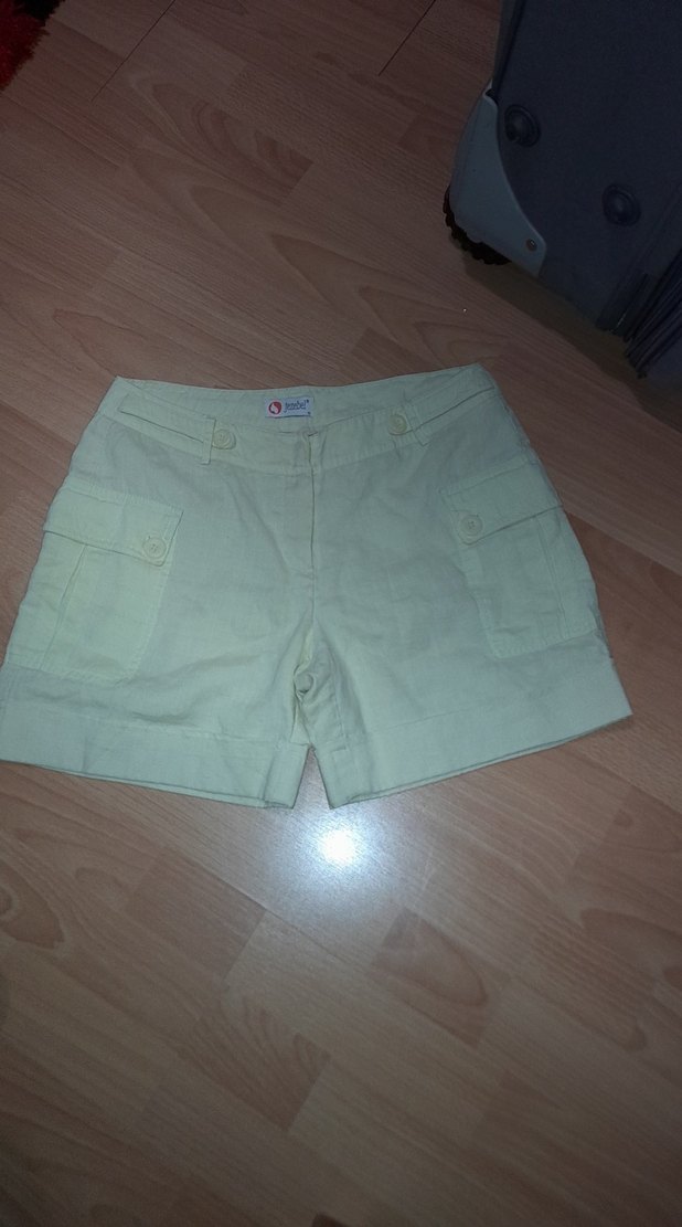 Pamuklu, bej renk, düğmeli cepleri olan bol kesim kadın mini şort. Sokak tarzı ve dış mekan kullanımı için uygundur.