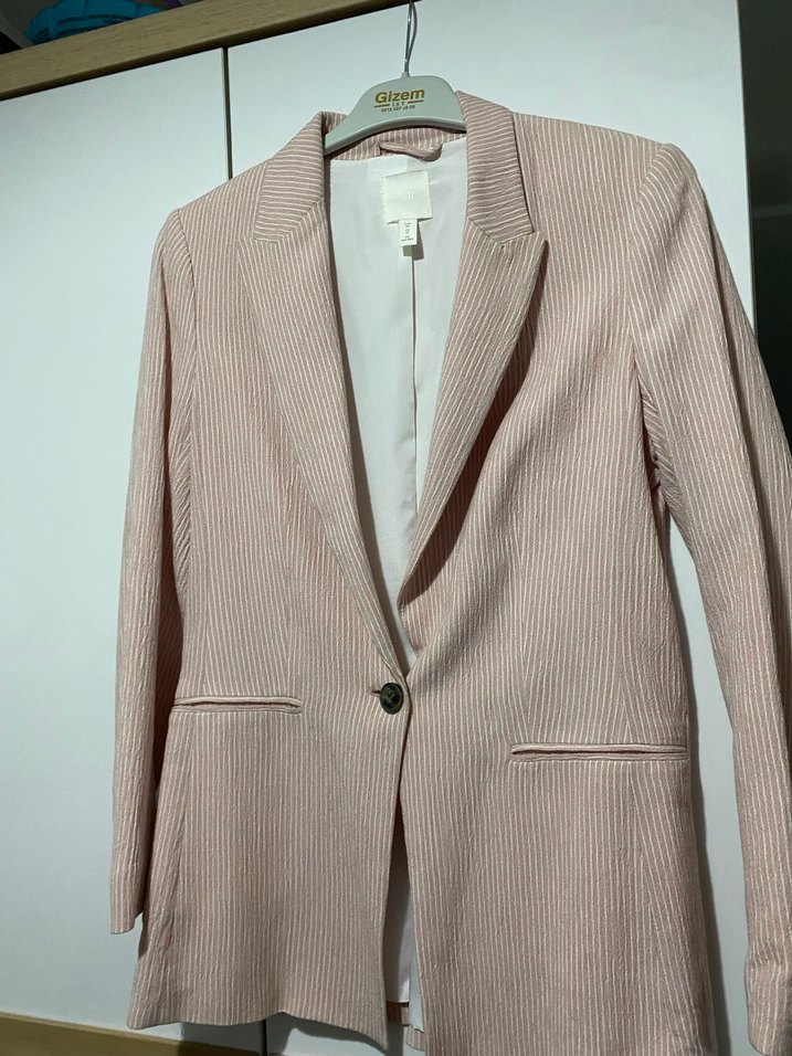Bej renkli, düğmeli, kesik yakalı kadın blazeri. Uzun kollu, normal kesim ve modern klasik tarzda, ofis kullanımı için uygundur. Sentetik kumaştan üretilmiştir.