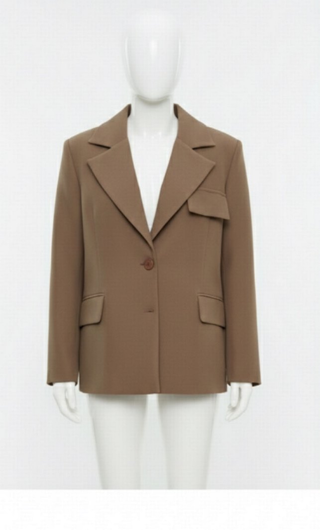 Bej renkli, düğmeli, uzun kollu kadın ofis ceketi. Normal kesim ve midi boyda, sade tasarımıyla iş ortamına uygundur. Sentetik kumaştan üretilmiştir.