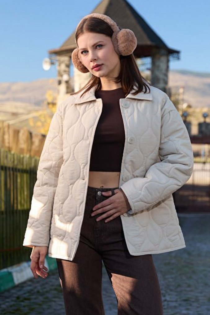 Bej Düğmeli Kadın Pamuk Kış Ceketi